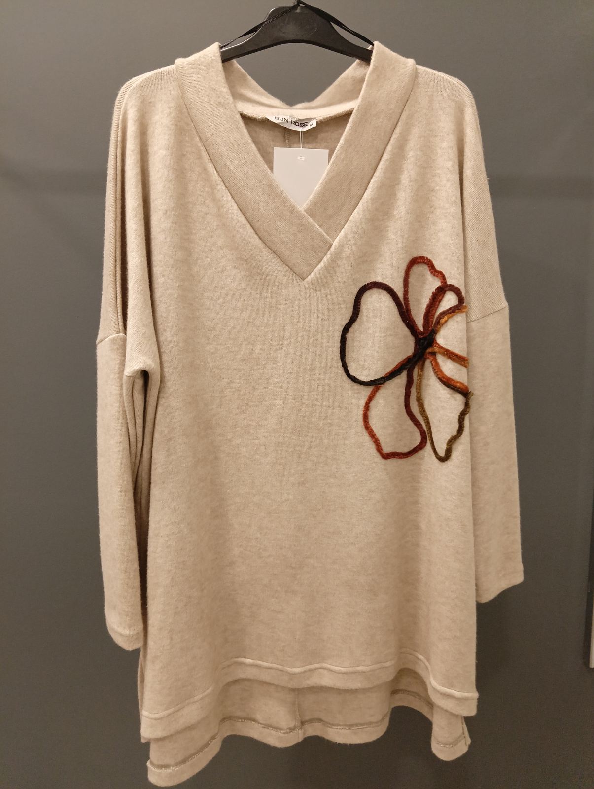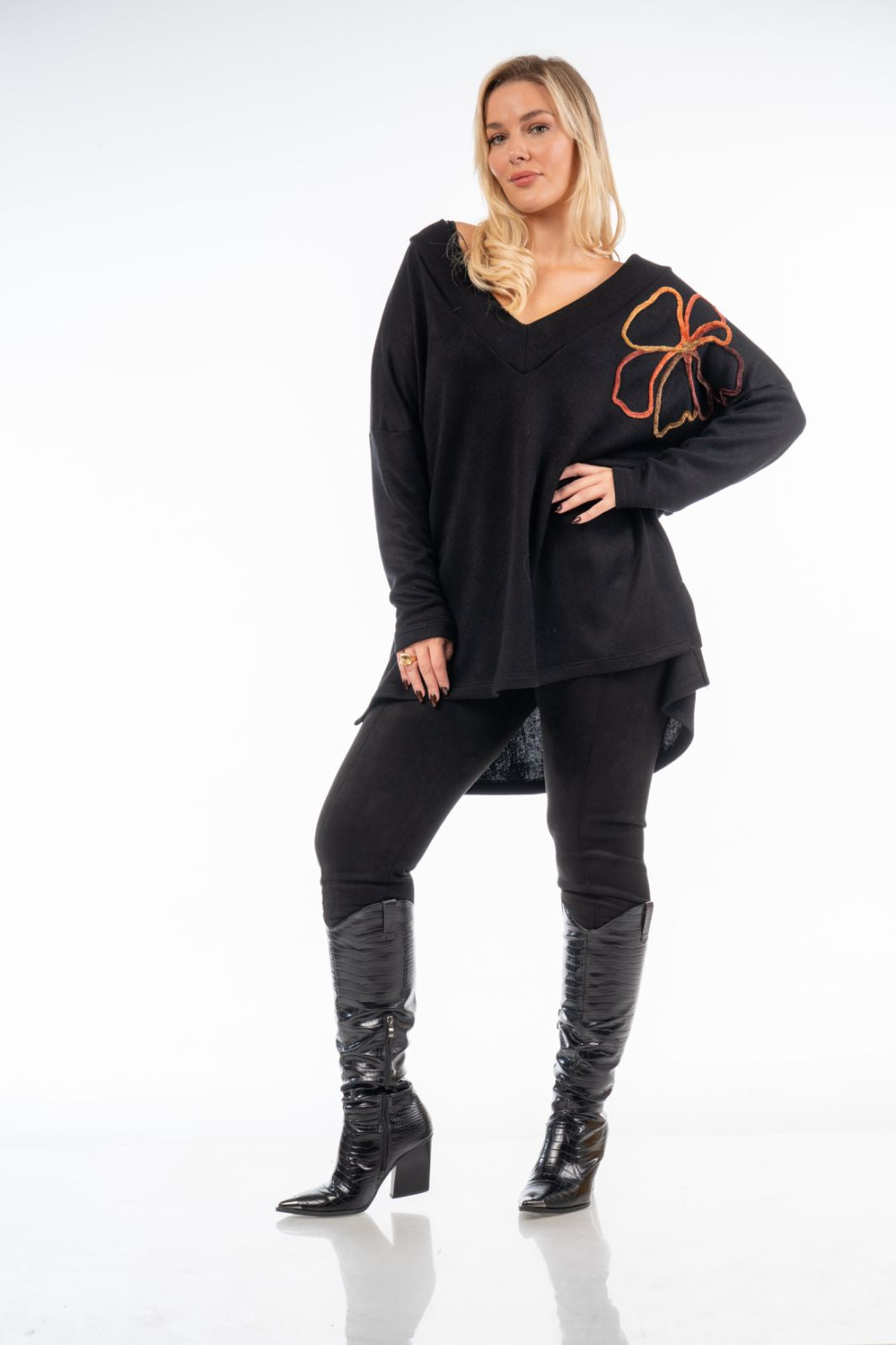 Oversize Μπλούζα σε Kashmir ύφασμα ελαστικό με βελούδινη ζεστασιά, άνισο, V ντεκολτέ, ελεύθερα μανίκια, βελούδο κέντημα μπροστά, σε ίσια πολύ άνετη γραμμή