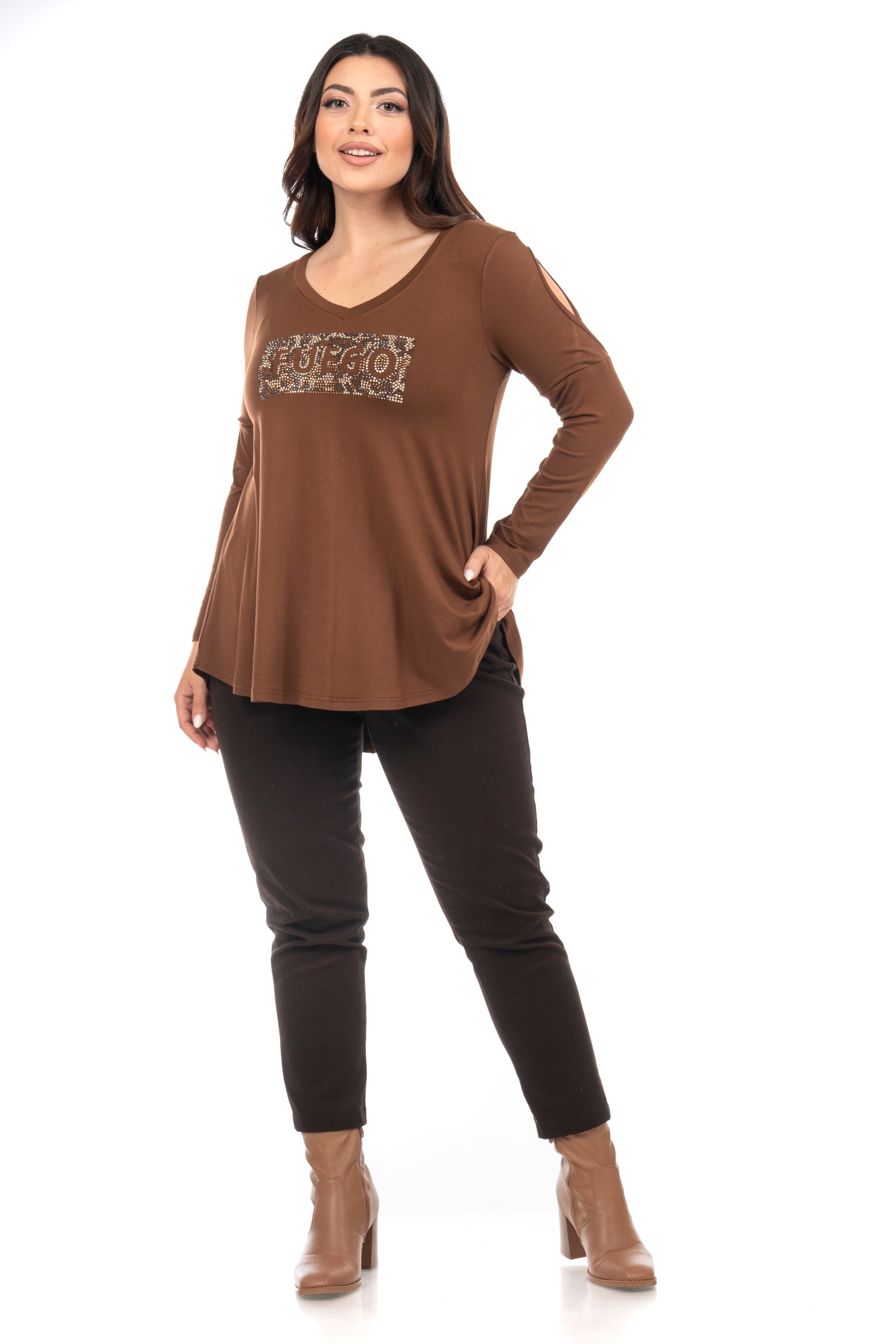 Μπλούζα Viscose σε Σοκολά & Μαύρο, με animal print FUEGO και σκίσιμο στα μανίκια