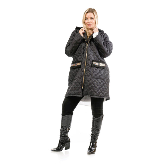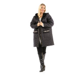 Μπουφάν μακρύ, αδιάβροχο καπιτονέ με επένδυση οικολογική γούνα, κουκούλα, εξωτερικές τσέπες με στρας καπάκι, σε πολύ άνετη γραμμή